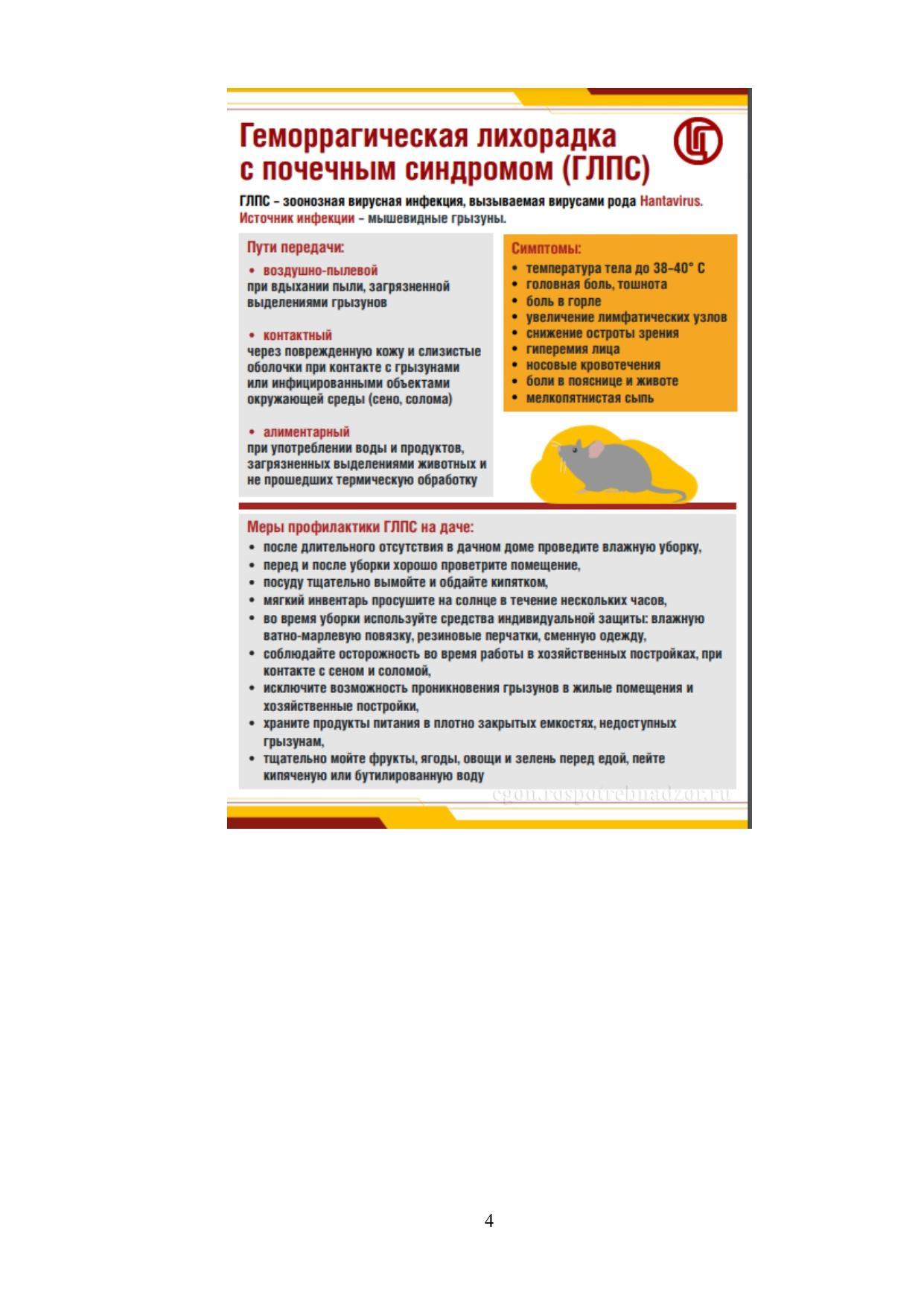 Больной человек не опасен для окружающих, так как не является источником инфекции! При появлении признаков заболевания после проведения работ, связанных с пылеобразованием, обратитесь за медицинской помощью и сообщите о фактах возможного контакта с мышевидными грызунами.